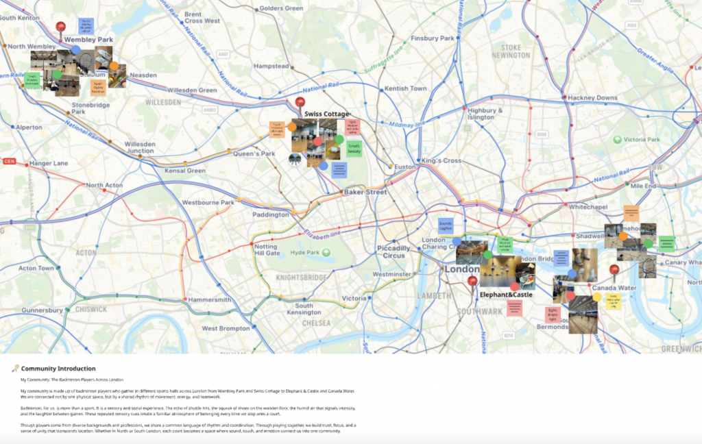 At the beginning, my community mapping covered four different areas in London Wembley Park, Swiss Cottage, Elephant & Castle, and Canada Water where I joined various badminton clubs using an app over the past two years. These clubs weren’t connected by a single location, but by a shared rhythm and energy that bonded players through play.