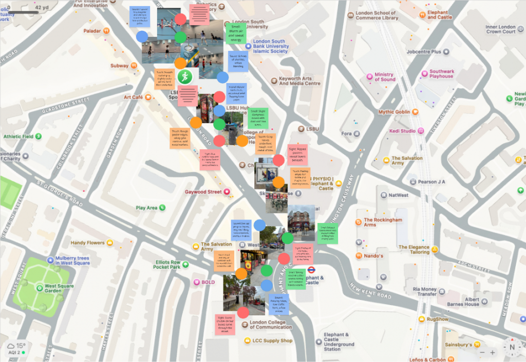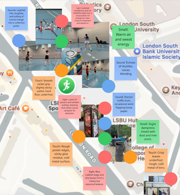 After the Thursday feedback session, I decided to narrow my focus to the LSBU Sports Hall, a place I visit most frequently. This helped me go deeper into sensory observation and analyse how design can express the feeling of belonging through motion and sound.