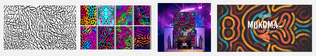 - Pattern and colour palette (yellow, pink, blue neon) merging African motifs with London’s retro disco vibes