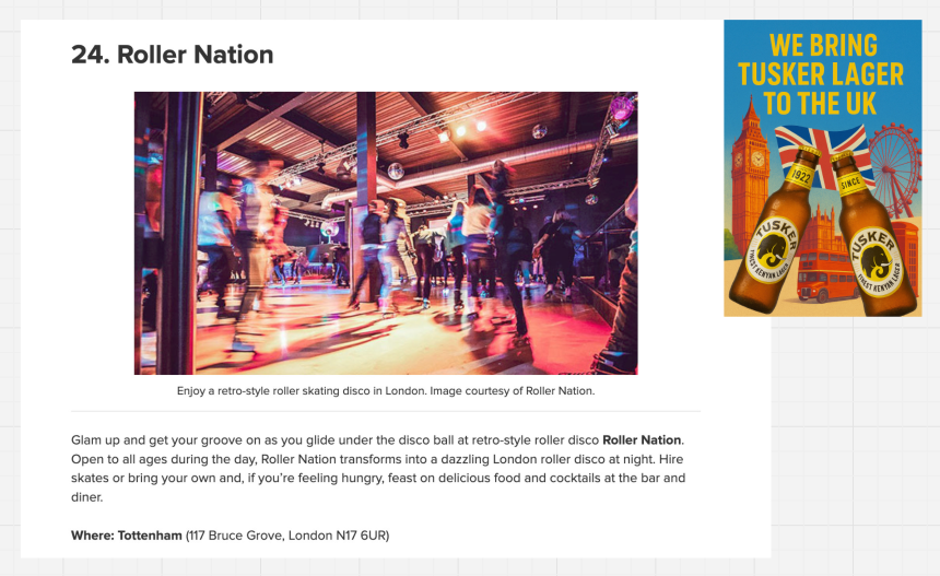 The activation reimagines Tusker’s East African warmth within London’s dynamic social scene through a roller-skating pop-up event, partnering with Roller Nation (Tottenham), one of the UK’s leading retro roller disco venues.